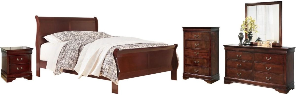Includes king sleigh bed (with headboard/footboard and rails), dresser with mirror, chest and nightstand