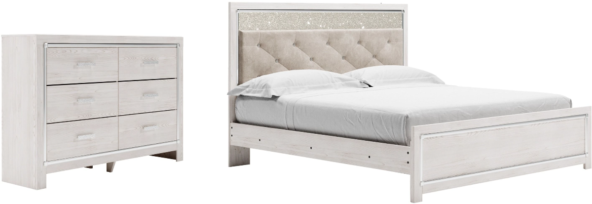 Includes upholstered panel bed (headboard, footboard and rails) and 6-drawer dresser