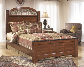 The "Fairbrooks Estate" bedroom collection features warm finishes and ornate detailing to create a furniture collection that is sure to enhance your bedroom decor with an inviting traditional design. The glossy reddish-brown finish that flows smoothly over the replicated cherry grain is beautifully enhanced by the deeply carved scroll motifs finished in an antique gold color and the ornately decorated inserts. With the large scaled swinging bail hardware with rosettes in an antique gold color handle, this collection flawlessly captures the warmth of finely crafted traditional furniture. Enhance your bedroom decor's beauty with the traditional style of the "Fairbrooks Estate" bedroom collection.